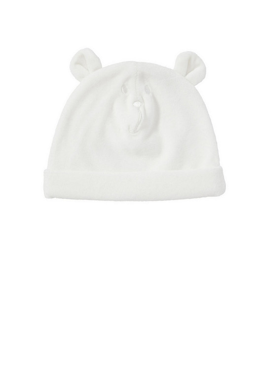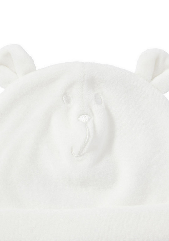 Шапочка фирмы F&F. Велюровая , молочного цвета, с ушками и вышивкой Мишка впереди, внутри трикотажная подкладка. Состав 100% хлопок подкладка и 76% хлопок, 24% полиэстер верх, размер 0-3мес, 3-6мес, 290руб