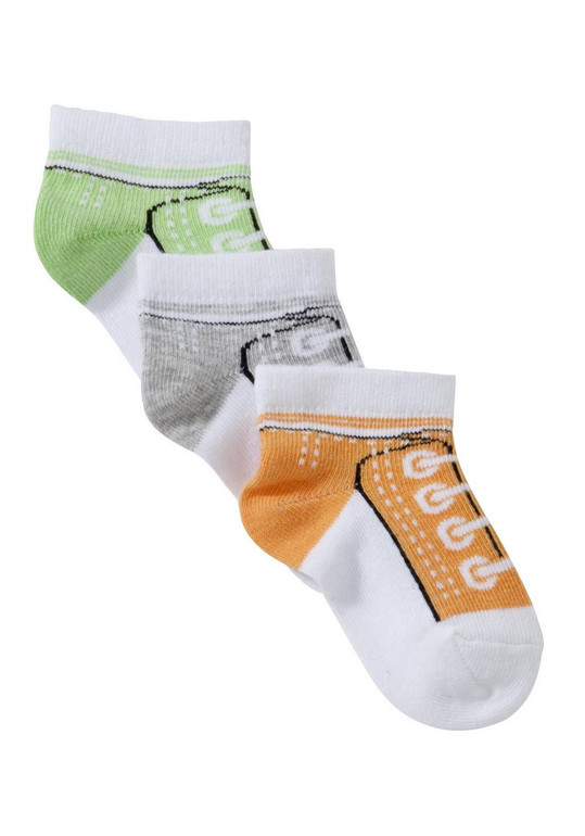 Носки фирмы F&F 3штуки в комплекте. Серые, оранжевые, салатовые с белой отделкой и рисунком "шнурки". Состав 87% хлопок, 12% полиамид, 1% эластан., 68% хлопок, 30%