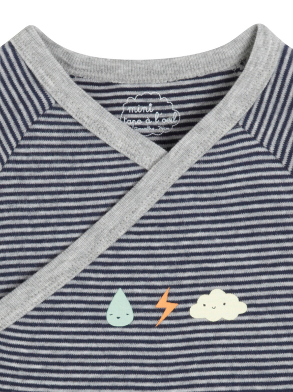 Боди с длинным рукавом фирмы t-a-o (Tape à l'oeil) Франция. Серые и темно-синие полоски, впереди рисунок облачко, капелька и молния. Сбоку и внизу на кнопках. Состав 100% хлопок, очень нежный трикотаж. размер 0-3мес (59см), 3-6мес (68см), 6-9мес(71см), 9мес (74см), 12мес(81см), 18мес (86см) 320руб.