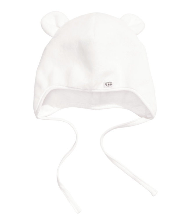 Шапочка фирмы H&M. Велюровая беленькая с ушками, внутри трикотажная подкладка, впереди эмблема Мишка, завязывается на веревочки. Состав 100% полиэстер, размер 4-6мес, 300руб