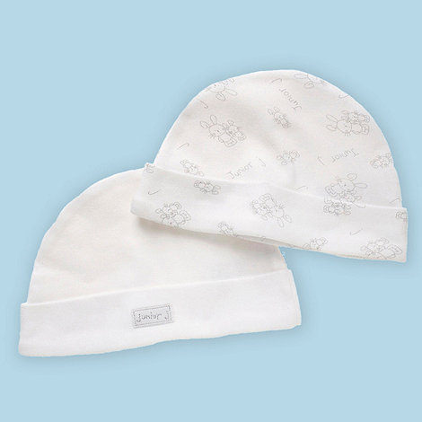 Шапочки фирмы Jasper Conran. Трикотаж в 1 слой, с отворотом. Белая с эмблемой впереди и белая с зайчиками по всей шапочке. Состав 100% хлопок, размер 6-12мес, 200руб любая