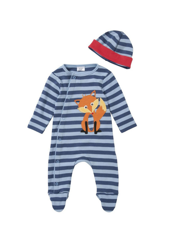 Комбинезончик и шапочка фирмы F&F. Комбинезончик голубые и синие полоски, аппликация Лисичка впереди, внизу расстегивается-застегивается на кнопках. Шапочка с красным отворотом.Состав 100% хлопок, размеры 9-12мес (74-80) 550руб