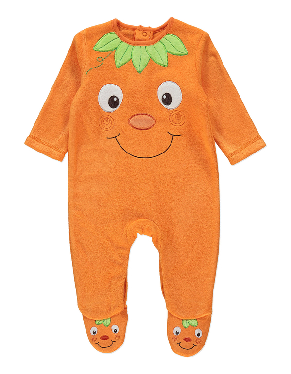 Комбинезончик флисовый фирмы George. Ярко-оранжевый, впереди аппликация Тыковка. Состав 100% полиэстер, размер 6-9мес (68-74), 500руб.