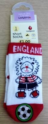 Носочки фирмы Lady bird. Белые с красной отделкой, надписью Англия и Львом. Мячик - это наклейка из бумаги, носочки без мячика. Состав 63% хлопок, 36% нейлон, 1% эластан. Размеры 3-6мес, 6-12мес. 60руб пара.