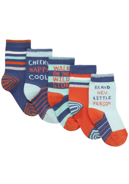 Носки фирмы F&F 5 штук в комплекте. Голубые, синие, оранжевые полоски и надписи. Состав Состав 71% хлопок, 28% нейлон, 1% эластан. размер. 19-22, 430руб