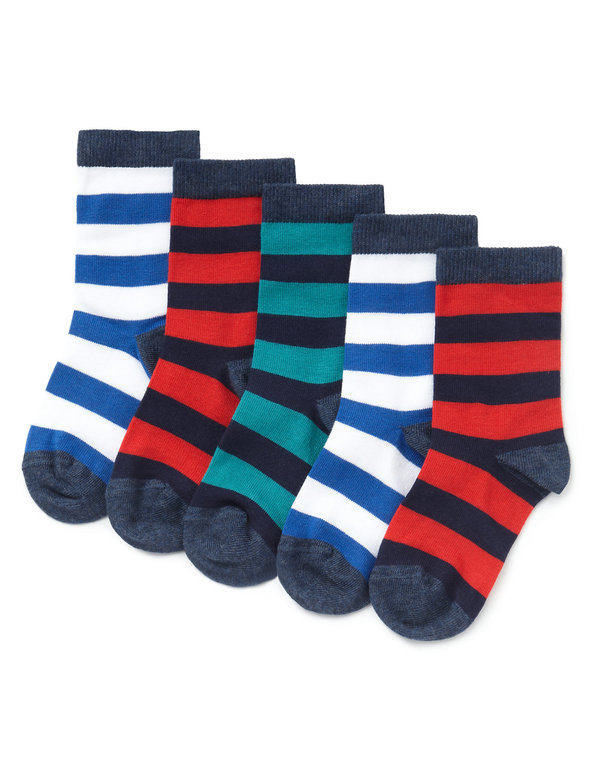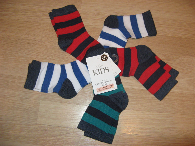 Носки фирмы Marks&Spenser 5штук в комплекте. В полоску белая-синяя, красная-синяя, зеленая-синяя. Состав 75% хлопок, 24% полиамид, 1% эластан., размер. 19-22, 490руб