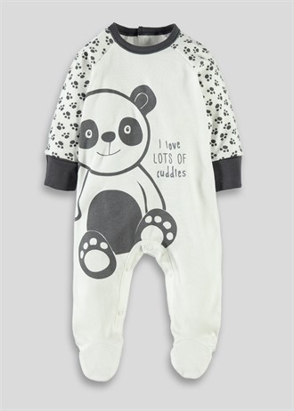Комбинезончик фирмы Matalan. Молочного цвета, рукава с рисунком следы, внизу расстегивается-застегивается на кнопках+застежка сзади 3 кнопки. На рукавах серые манжеты, впереди большой рисунок медведь Панда. Состав 100% хлопок, размеры