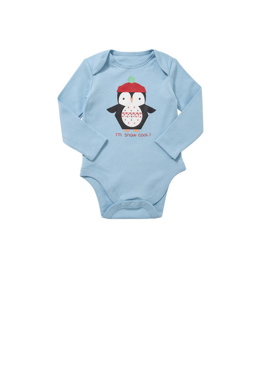 Бодик с длинным рукавом фирмы F&F. Голубой с пингвином впереди. 3-6мес(62-68), 6-9мес(68-74), 9-12мес (74-80), 12-18мес(80-86) 270руб
