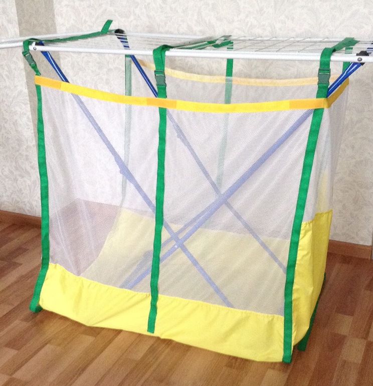 Манеж к полкам крепится стропами на фастексах, надежно держится. Много вариантов разместить его на полке.