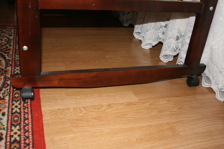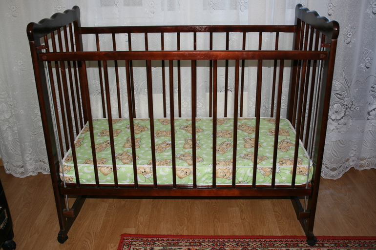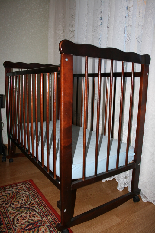 Цвет - красное дерево. Колеса съемные, есть полозья, на которых кроватку можно качать.