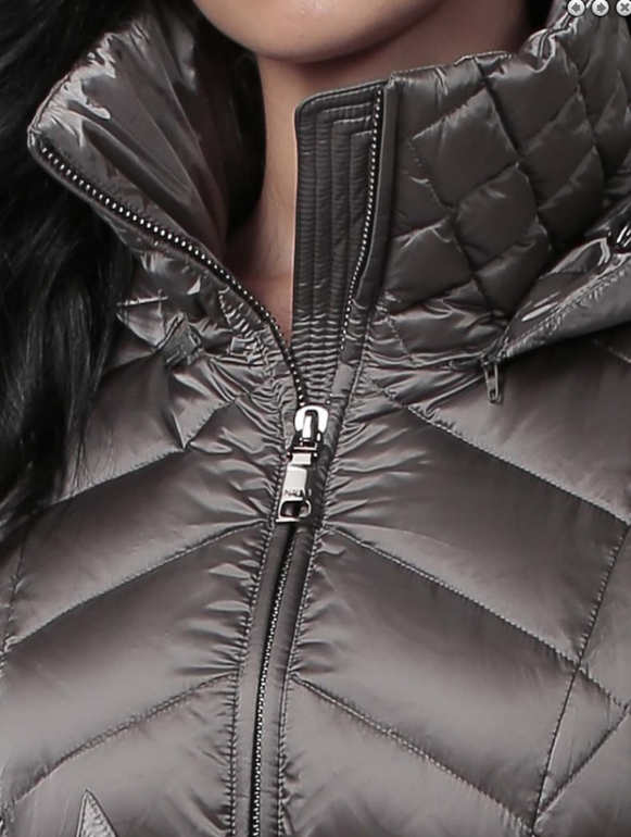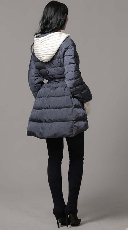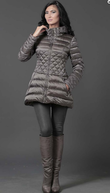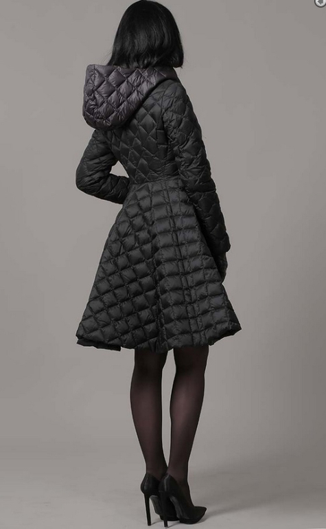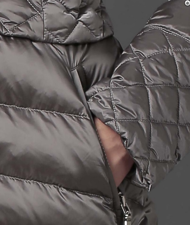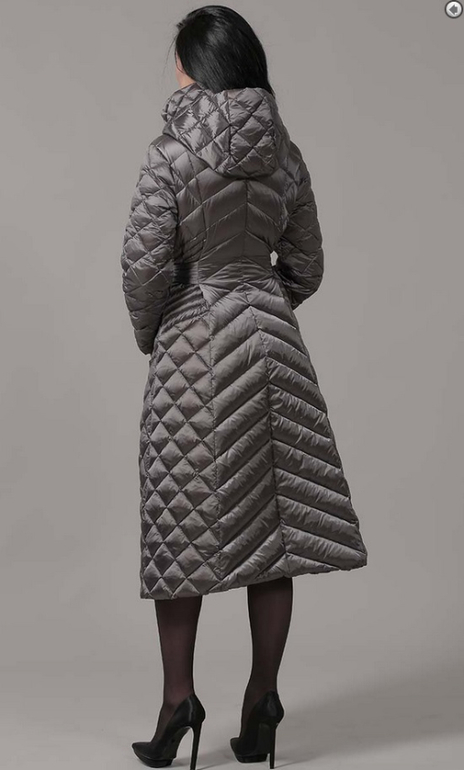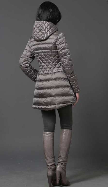 №5 Модный пуховик на каждый день. Приталенный силуэт прекрасно подчеркивает стройность фигуры. Модель декорированна стеганными вставками на рукавах, талии и капюшоне.