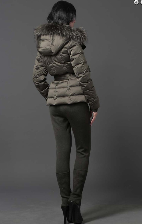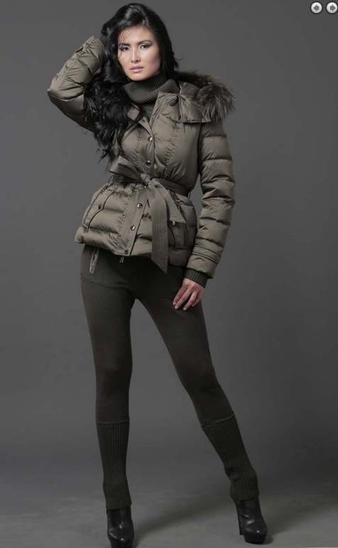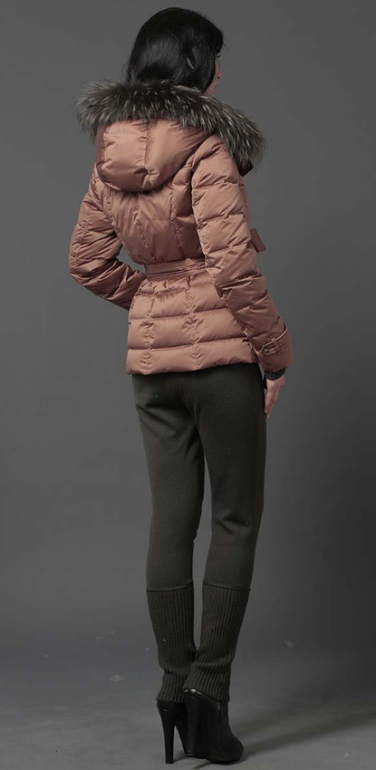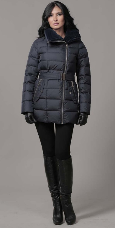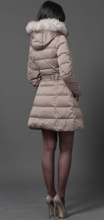 №24 Элегантный пуховик на каждый день. Приталенный силуэт прекрасно подчеркивает стройность фигуры. Спереди расположены удобные застежки-кнопки. Воротник модели украшен мехом рекса. Пуховик дополнен накладными карманами и удобным поясом в тон..Мех не съемный