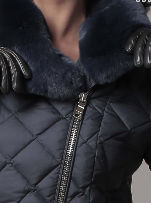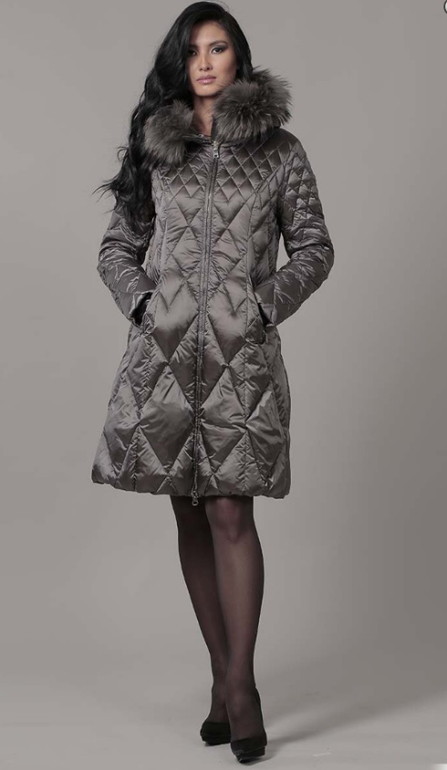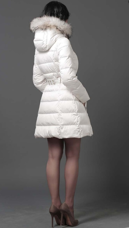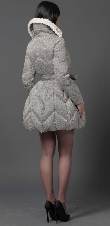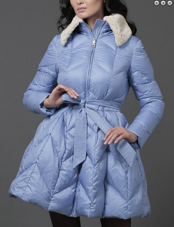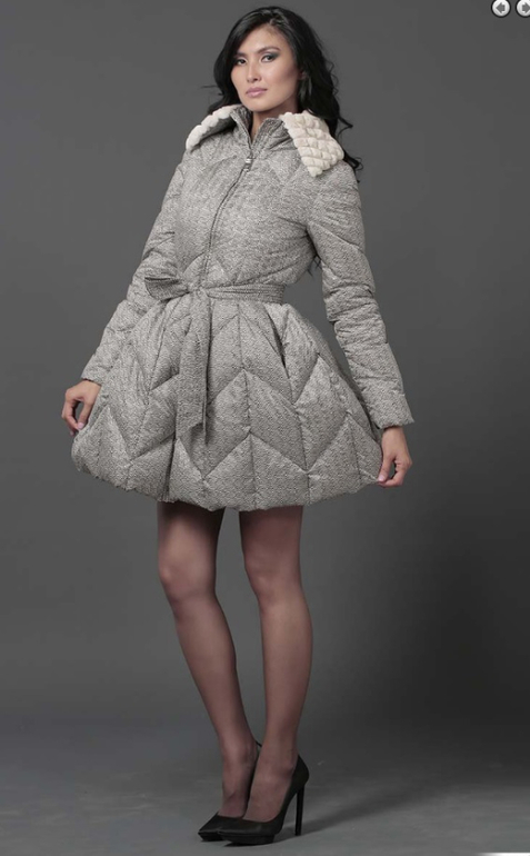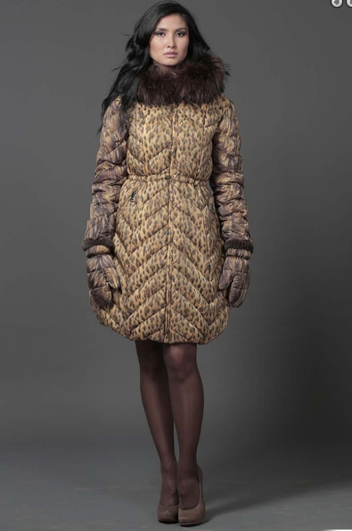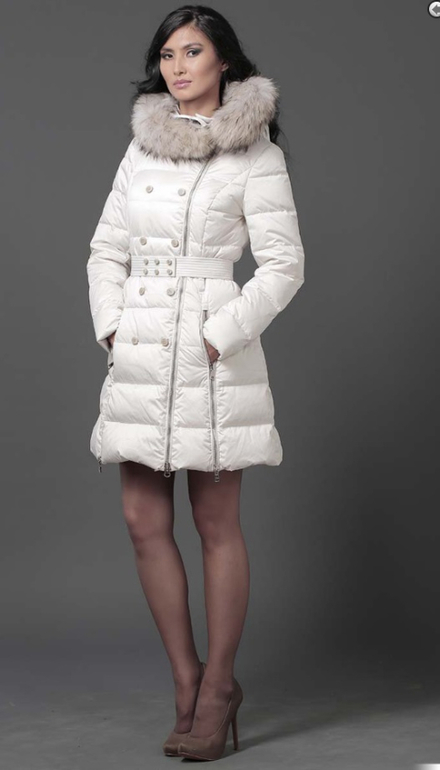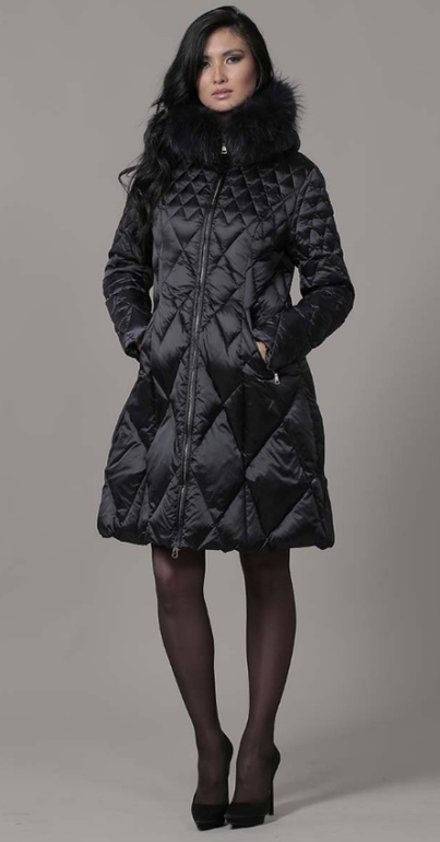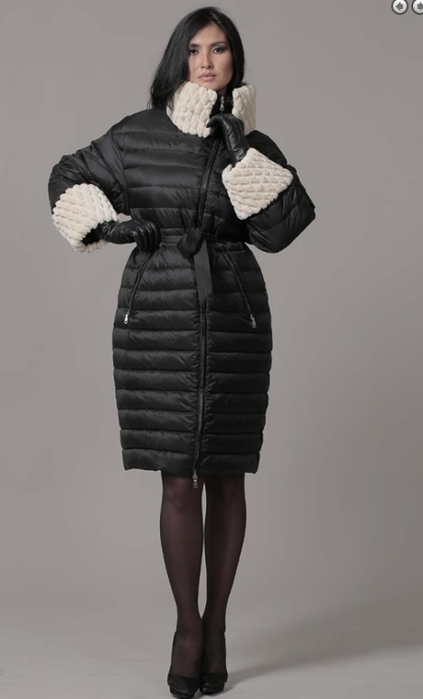№15 Элегантная модель в стиле New Look. Приталенный силуэт прекрасно подчеркивает стройность фигуры, а расклешенный подол придает образу романтичности. Спереди расположена удобная застежка-молния. Воротник и кокетка модели украшены мехом рекса, ,. Особая технология обработки придает воротнику безупречный внешний вид. Пуховик дополнен удобным боковыми карманами.