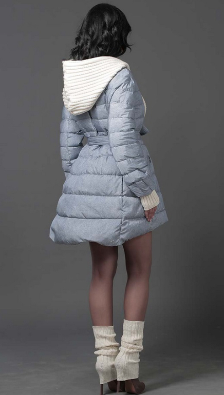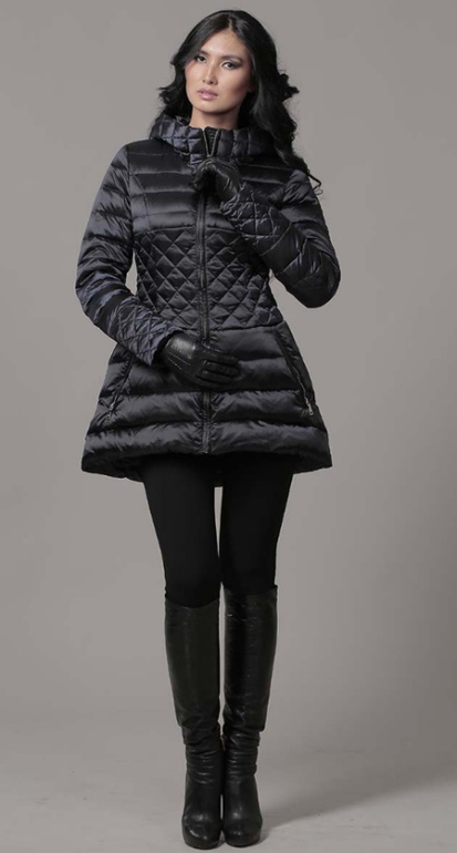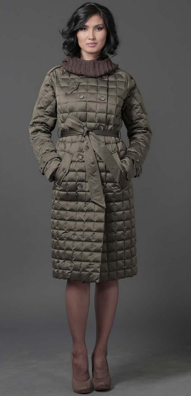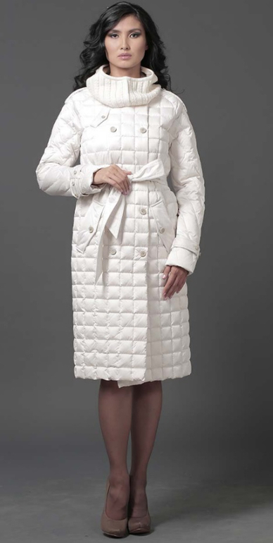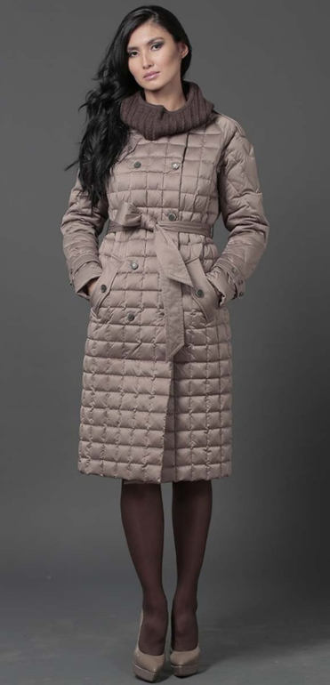 №13 Элегантный пуховик на каждый день. Приталенный силуэт прекрасно подчеркивает стройность фигуры, а расклешенный подол придает образу романтичности. Спереди расположена удобная застежка-молния. Модель дополнена косынкой-капюшпном.