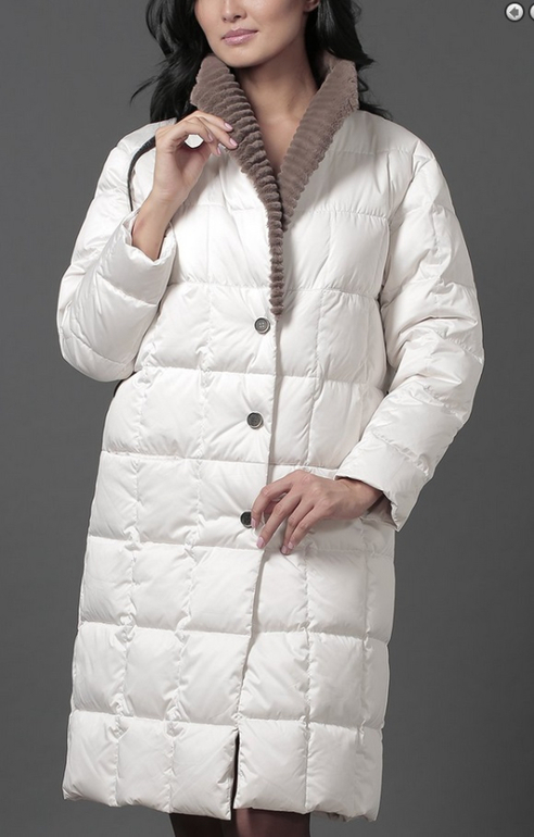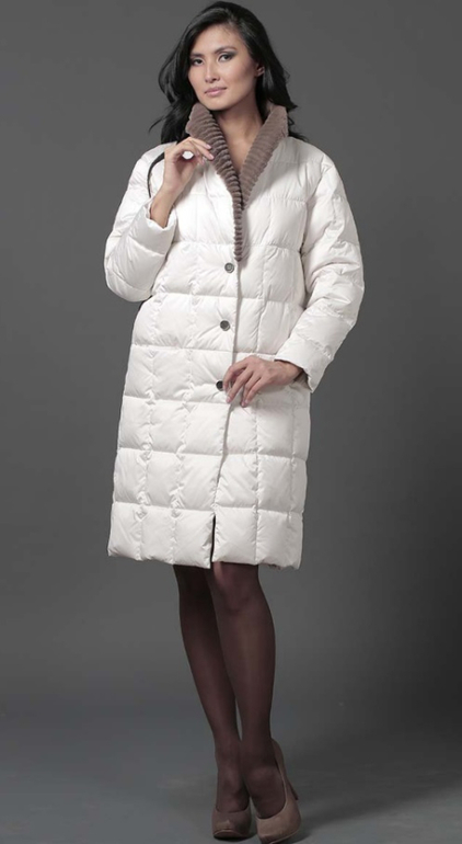№4 Классический пуховик на каждый день. Модель прямого силуэта застегивается на кнопки. Воротник украшен мехом рекса. Особая технология обработки придает воротнику безупречный внешний вид.Мех не съемный, Длина длинная.
