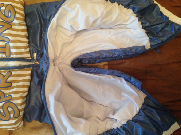 Комбинезон-трансформер с центральной застежкой на молнию, по конструкции имитирующий костюм.Нижняя ветрозащитная планка выполнена с ограничителем. Рукав и капюшон втачной. По краю капюшона расположена регулируемая кулиса со шнуром резинкой и стопорами.По верхнему краю капюшона имеется узкий кант из отделочной ткани.Средняя часть комбинезона отрезная по линии талии. Низ рукавов собран на резинку. Длина брюк регулируется отворотными манжетами. За счет молний по шаговому шву и кнопок на ножках комбинезон трансформируется в конверт.