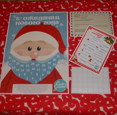 - своеобразный адвент-календарь - плакат формата А2 с изображением деда Мороза, на бороду которого нужно каждый день клеить круглые наклейки (лист с наклейками прилагается), чтобы было интереснее ждать праздника и чтобы всегда было наглядно видно, сколько ещё дней осталось до наступления нового года