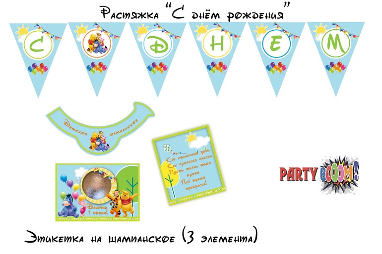 В набор вошли: 2 растяжки, плакат "На кого же я похож?", плакат "Первый год жизни", колпачки, топперы, этикетка на шампанское.