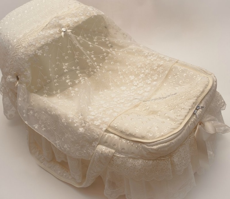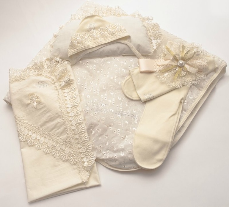 В комплект входят: переноска, одеяло подушка матрасик, распашонка, ползунки, чепчик, уголок, лента, брошка. Идеально на выписку. Каждое изделие украшено камнями.цена 5500