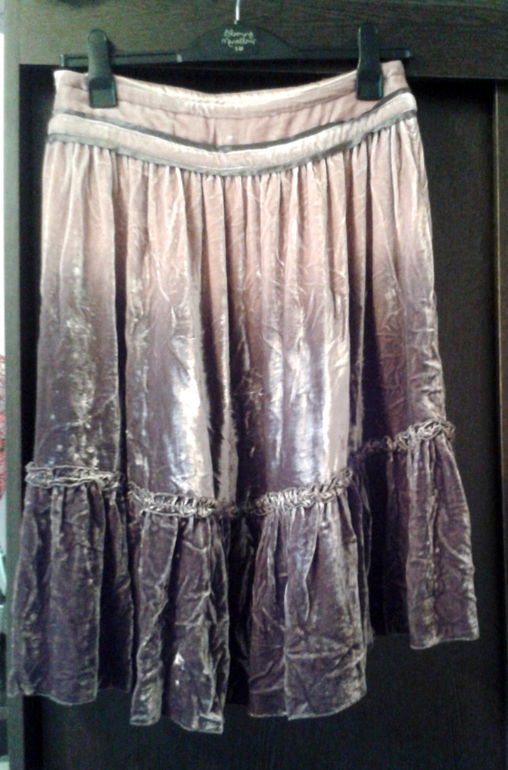 Юбка Roberto Cavalli, производство Италия, бархат, шелк, цвет от розового к серому, на фото видно плохо, на 44-46 размер, длина ниже колена, есть голограмма подлинности брэнда и качества, 4000 р.