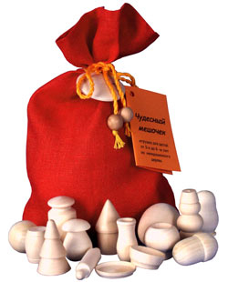 Очень полезная и увлекательная игра на развитие мелкой моторики и воображения. Каждый игрок по очереди достает из мешочка одну фигурку и затем, не заглядывая в мешочек, на ощупь находит ему парную. В мешочке 30 деревянных фигурок, т.е. 15 пар.![]()