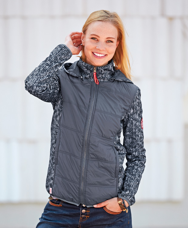 Softshell куртка с ветро и влагоустойчивым материалом. Руки и шея вязаный узор в "печатном" качество нейлона. Куртка имеет боковые карманы с застежкой на молнию и съемной капюшон.