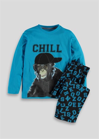 Пижама "Обезьянка" фирмы Маталан. Брючки черные с голубыми буквами и кофточка рко-голубая с рисунком-наклейкой Обезьянка.