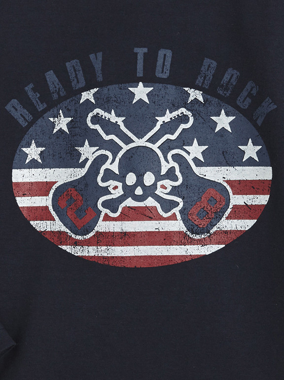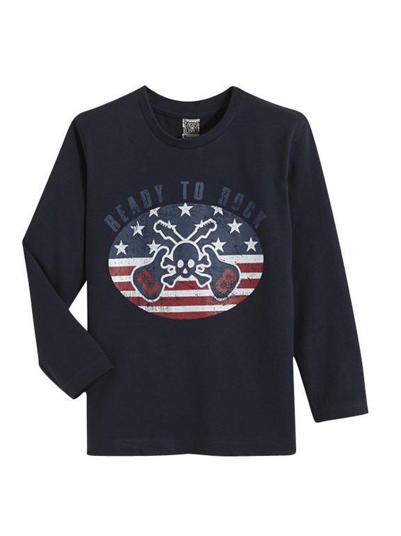 Кофточка с длинным рукавом фирмы t-a-o (Tape à l'oeil) Франция. Темно-синяя, впереди рисунок гитары, череп и надписи. 100% хлопок. Размер 6л (116), 8л (128) 350руб