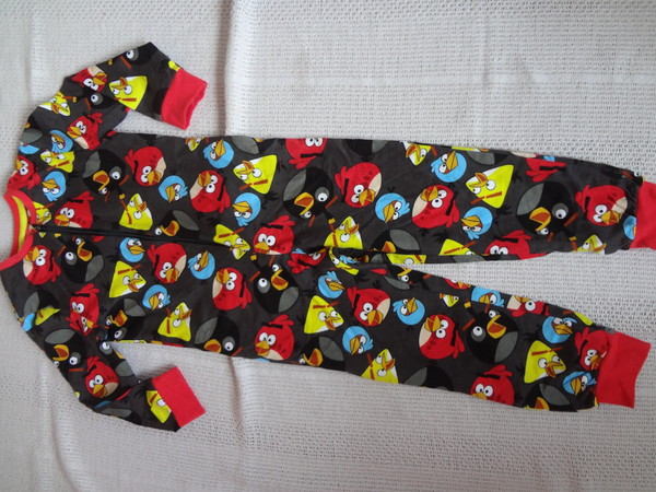 Пижама-слип фирмы F&F. Темно-серая, с красной отделкой, с яркими птичками Энгри Бердс по всей пижаме. Застегивается впереди на молнию, ребенку удобно застегнуть самому. Состав 100% хлопок. Размер 4-5г *(104-110), 5-6л(110-116), 6-7л (116-122) 850руб