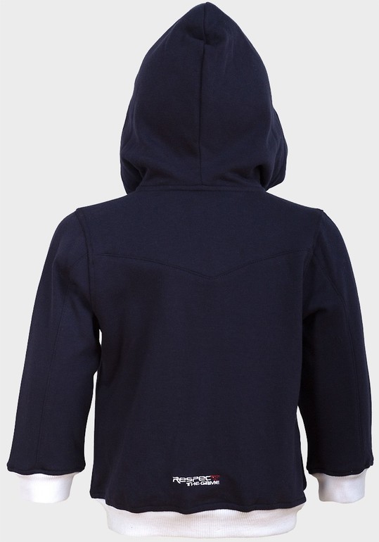 Толстовка с капюшоном темно-синяя фирмы F&F. Внутри с небольшим начесом, отделка серым цветом по низу и манжеты, застежка- молния, 2 кармана впереди, на рукаве и на груди надписи. Состав 100% хлопок. Размер 5-6л (110-116), 590руб