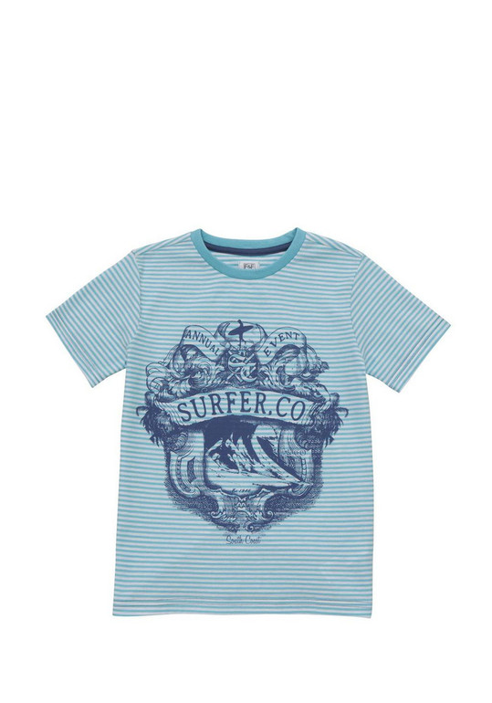 Футболка фирмы F&F. Полоски белая и цвет морской волны, рисунок и надписи впереди. Состав 100% хлопок. Размеры 5-6л(110-116), 300руб