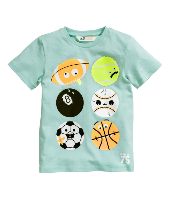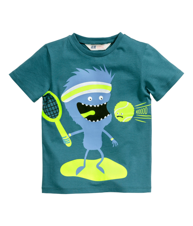 Футболка фирмы H&M. Сине-зеленая с яркими рисунком-наклейкой Монстрик впереди. Состав 100% хлопок. 6-8л (122-128) 350руб.