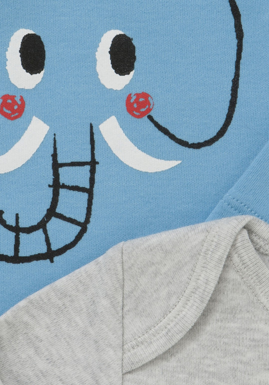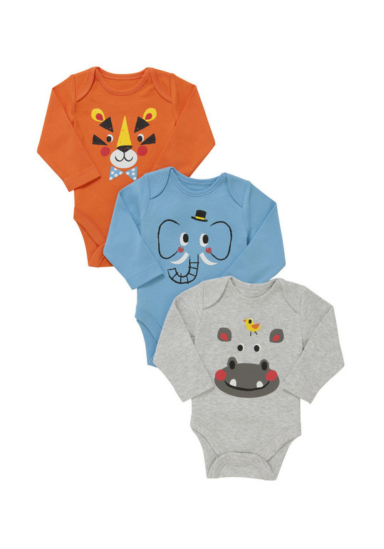 Боди фирмы F&F. Застежка кнопки внизу. Голубое с рисунком слоник, серое с рисунком бегемотик и оранжевое с рисунком тигрс бабочкой. Состав 100% хлопок, размеры