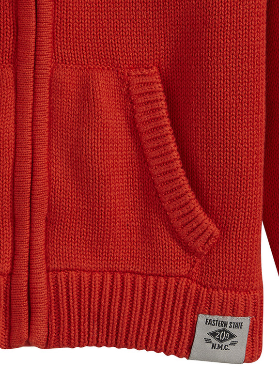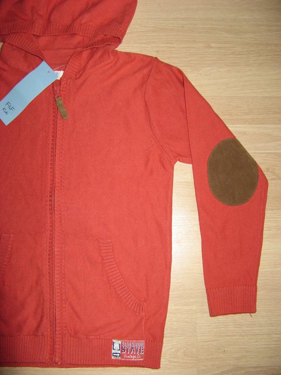 Кофта на молнии с капюшоном фирмы F&F. Кирпично-оранжевая, тонкой вязки, по бокам карманы, сбоку эмблема, на локтях коричневые декоративные "заплатки" под замшу.. Состав 100% хлопок. Размер 5-6л(110-116), 600руб.