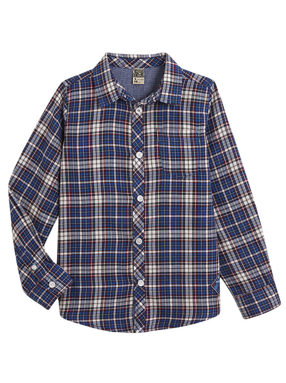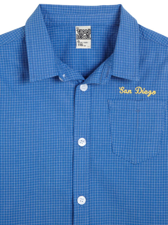 Рубашка с длинным рукавом фирмы t-a-o (Tape à l'oeil) Франция. Синяя в мелкую клетку, вышивка впереди на груди. Состав 100% хлопок. Размеры 3г (96), 4г(104), 5л(110), 6(116), . 550руб.