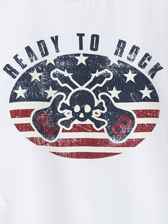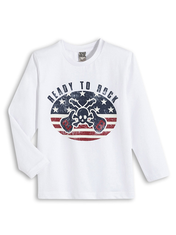 Кофточка с длинным рукавом фирмы t-a-o (Tape à l'oeil) Франция. Белая, впереди рисунок гитары, череп и надписи. 100% хлопок. Размер 6л (116), 8л (128) 350руб