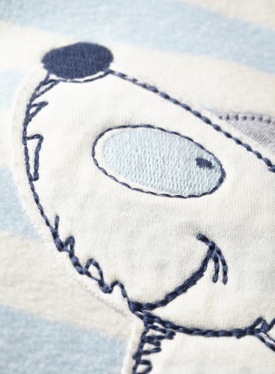 Пижама-слип флисовая фирмы BHS. Полоска белая-голубая, аппликация собачка впереди, застегивается на кнопки, на стопах противоскользящие точки. состав 100% полиэстер. Размер 2-3г(98), 690руб