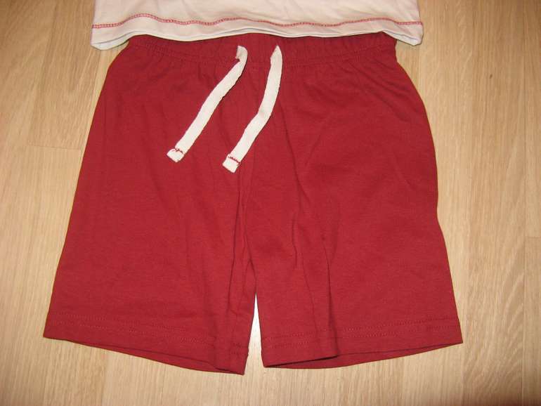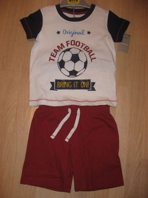 Пижама или комплект для дома шорты и футболка. Вообще, качество такое, что можно и на улицу носить, ничем не отличается от комплектов для улицы. Фирма F&F, состав 100% хлопок. Размер