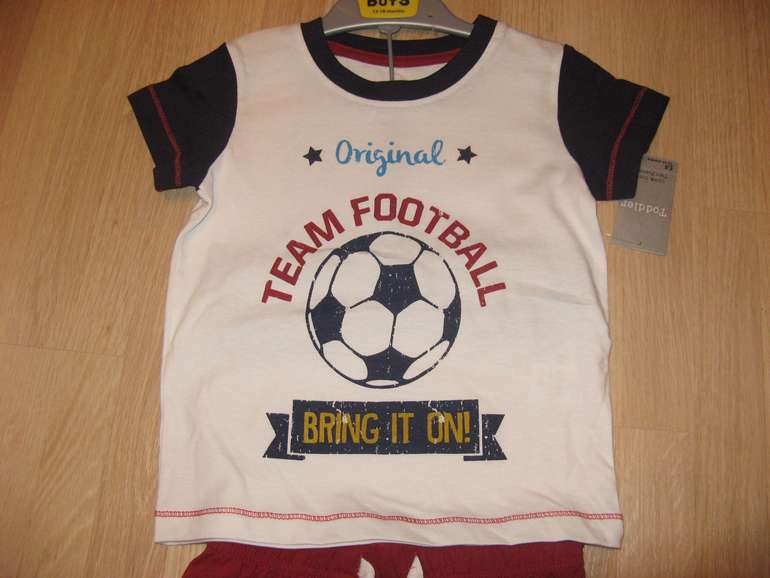 Пижама с длинным рукавом фирмы Mothercare. Кофточка ярко-желтая с синими рукавами, впереди принт футбольный мяч, штанишки темно-синие пояс на резинке, состав 100% хлопок. Размер 2-3г (92-98), 3-4г (98-104) 4-5лет(104-110). 490руб.