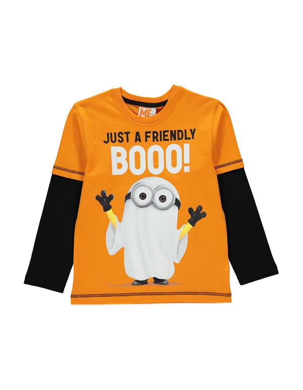Кофточка с длинным рукавом "Гадкий я" фирмы Geprge. С эффектом 2 в 1, оранжевая с черными рукавами, впереди Миньон-привидение и надпись Состав 100% хлопок, размер 5-6л *(110-116) 390руб