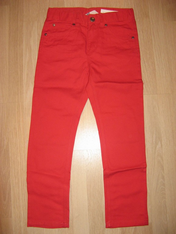 Брюки фирмы H&M. Хлопковая ткань ярко-красного цвета , 3 кармана впереди, 2 сзади, застежка пуговица+молния, внутри резинка-утяжка по кругу. Состав 100% хлопок. Размер 6-7л (116-122), 650руб