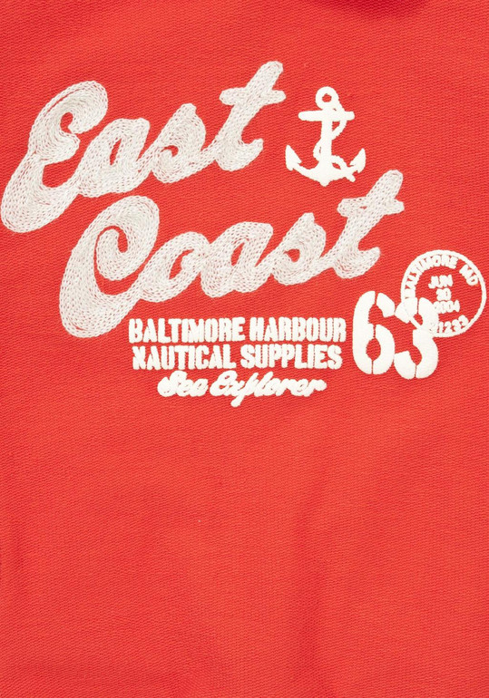 Кофта-худи с капюшоном фирмы E-BOUND. Красная, без начеса, плотный трикотаж петельками наружу. Впереди вышивка надписи, манжеты на рукавах , 2 кармана по бокам.Состав 60% хлопок, 40% полиэстер. размер 6л(116) 550руб.