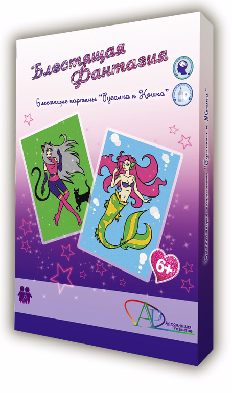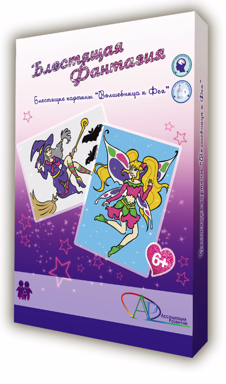 В набор «Блестящая фантазия» входит: трафарет (трехслойная картонная основа формата А4 с вырезанным лазером контуром рисунка); блестки 9 цветов в пластиковых баночках (общая масса 28 грамм); кисть; подробная фото-инструкция.