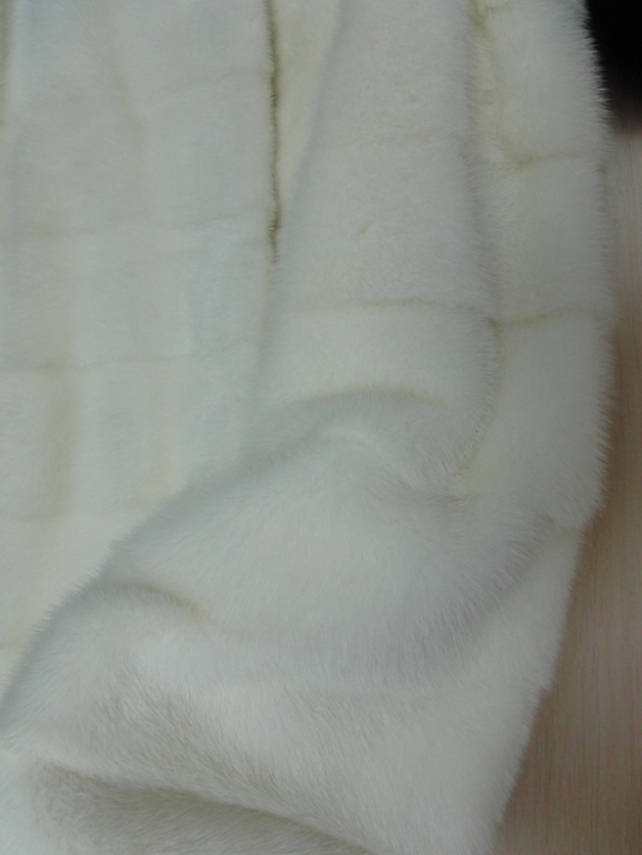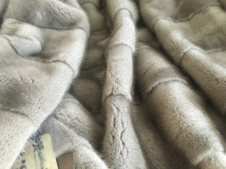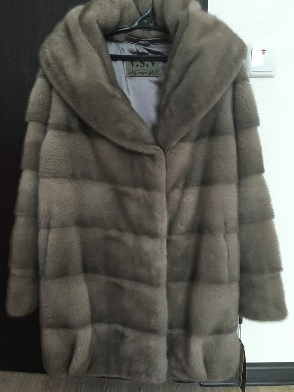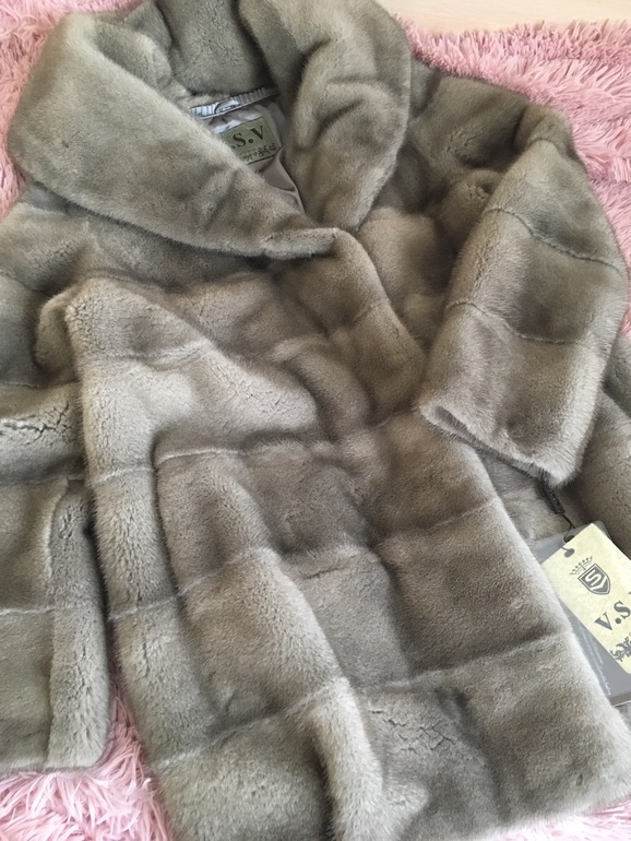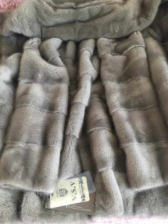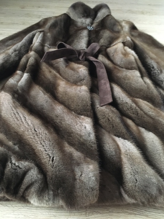 6) Поперечная раскладка меха, длина 80 см, цвет пудра, капюшон, рукав отстегивается до длины 3/4. Греция. Размер 40-42. 75 000 руб.