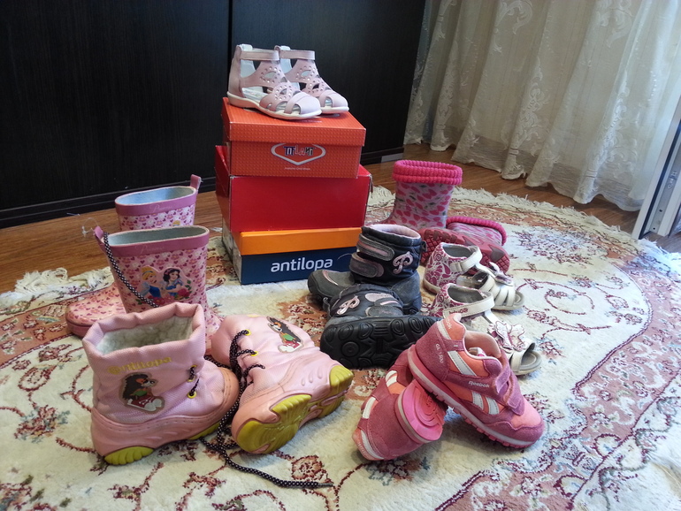 Резиновые сапожки 2 пары с утеплителем и без по 400р каждая(размер 24-25).туфли лаковые потерты мысы 26р-400р. кроссовки рибок в идеальном состоянии 800р (26р)сапоги осень-весна примиги 600р (25р) Зимние демары антилопа( 22-23р)500р.босоножки 25р-26р 400р