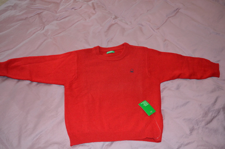Цвет: красный (спокойный). Состав: 80% шерсть, 20% полиамид. Размеры: высота изделия 40см; ширина 37 см, длина рукава 31.5см. Фирма: United Colors of Benetton. Сделано в Хорватии.
