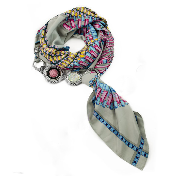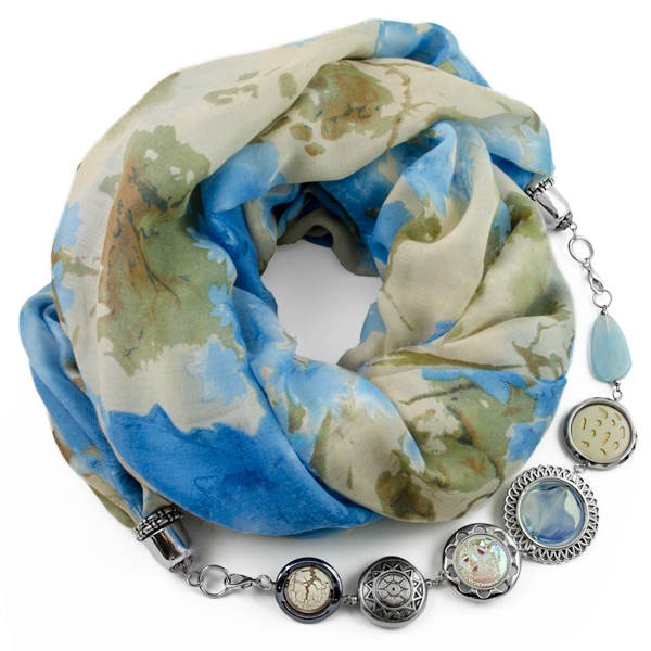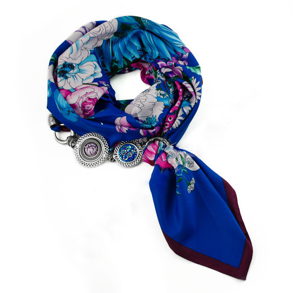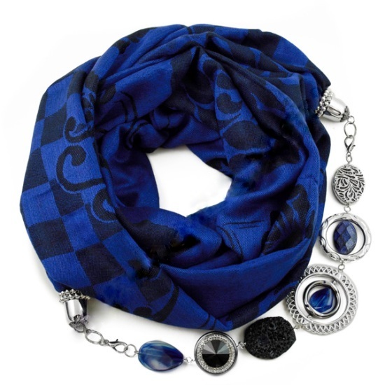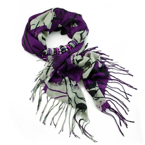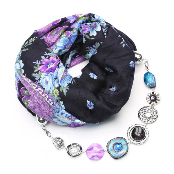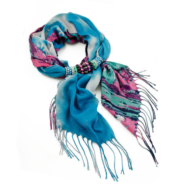 Ткань очень приятная, мягкая и теплая. Фурнитура оригинальная и очень легкая, не деформирует шарф. В производстве бижутерии используются кристаллы Swarovski Crystallized TM, настоящее чешское стекло и современные легкие гиппоалергенные материалы, не содержащие вредные химические вещества.