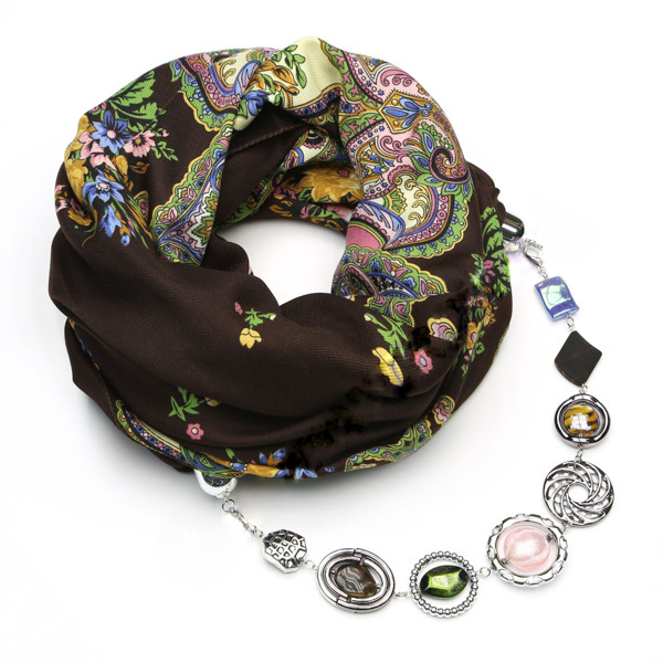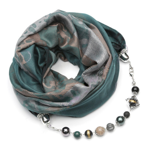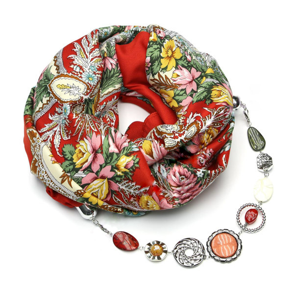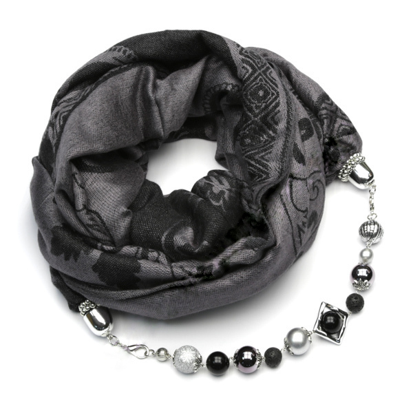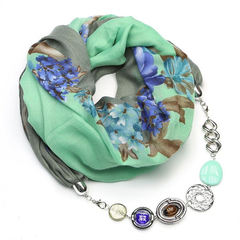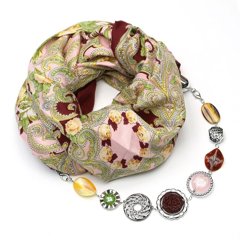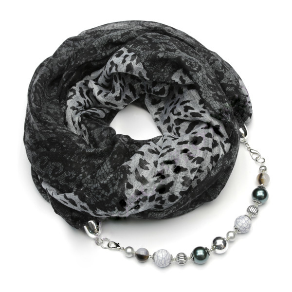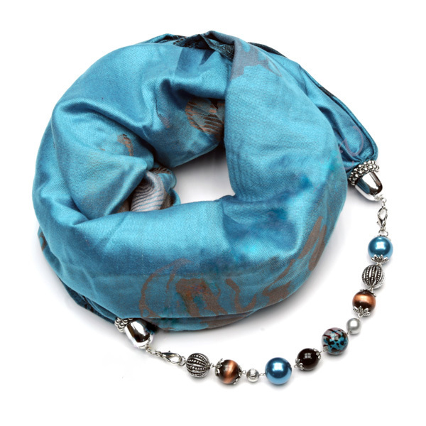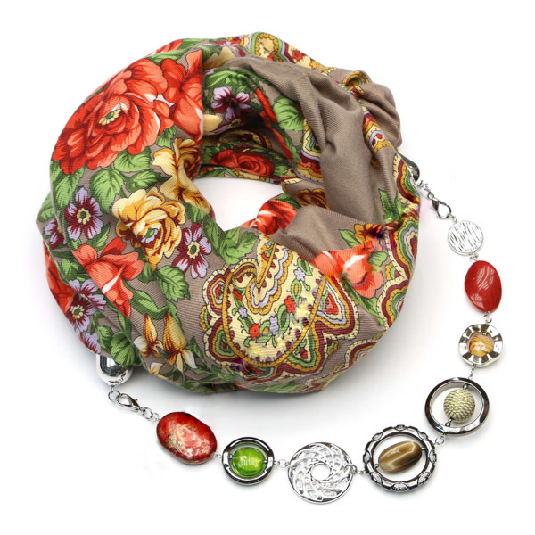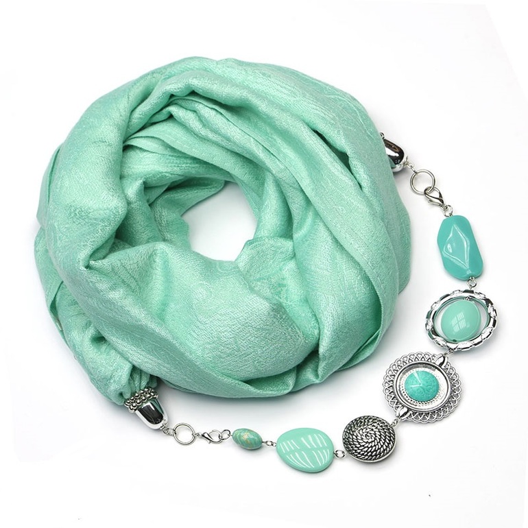 1. Шарф-ожерелье с бижутерией легко и просто укладывается вокруг шеи в 2-3 оборота. Шарфик оснащён замочком-карабином, благодаря которому его удобно одевать.