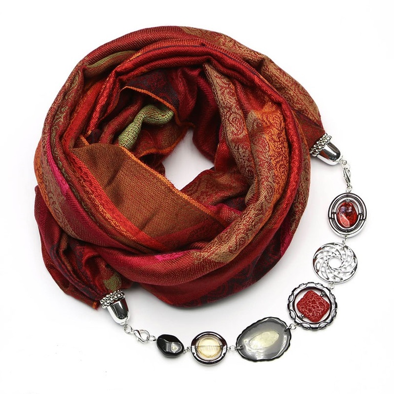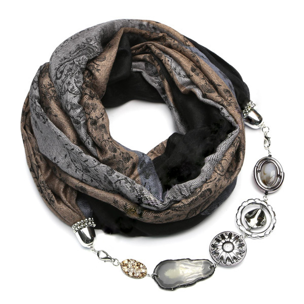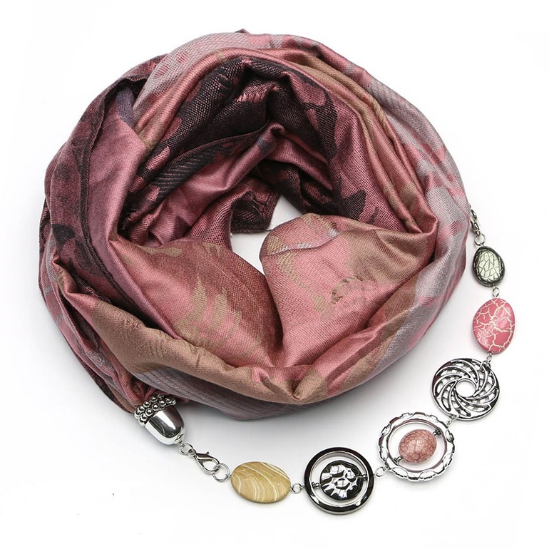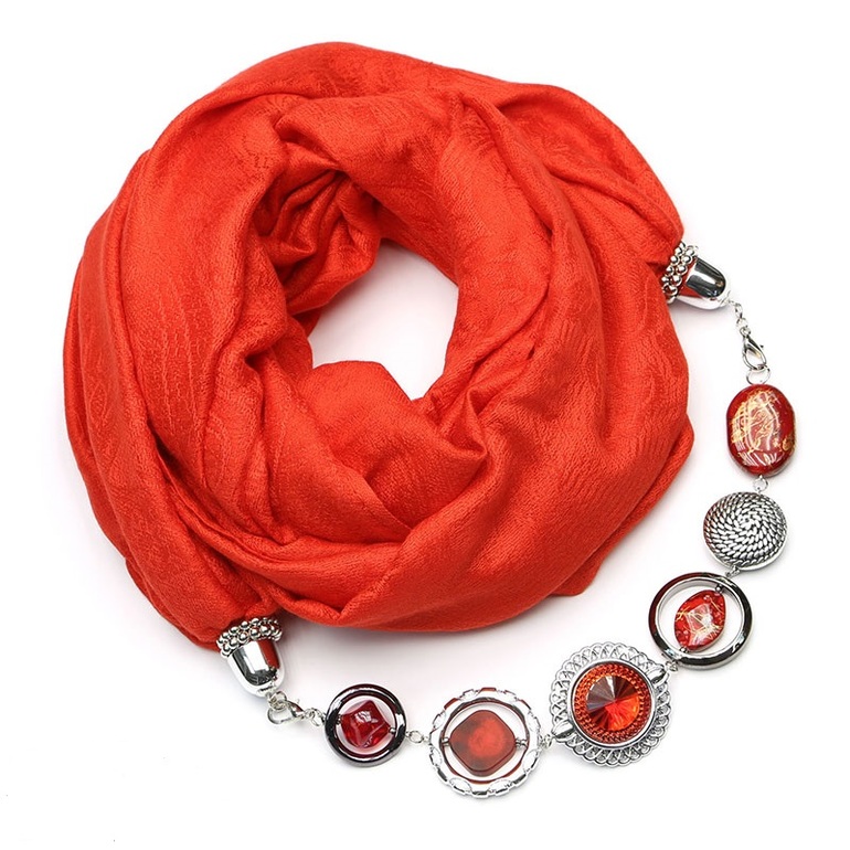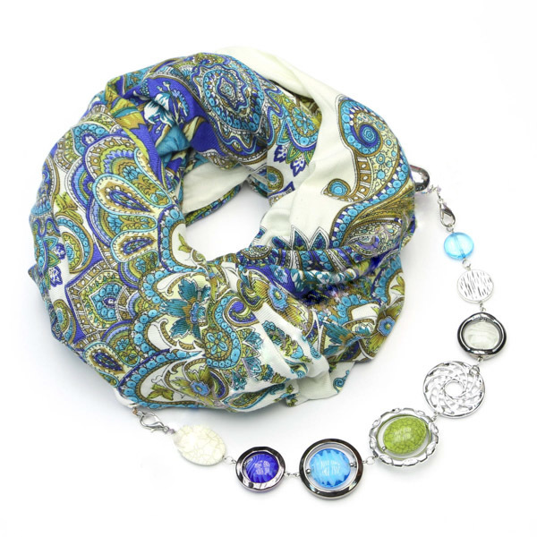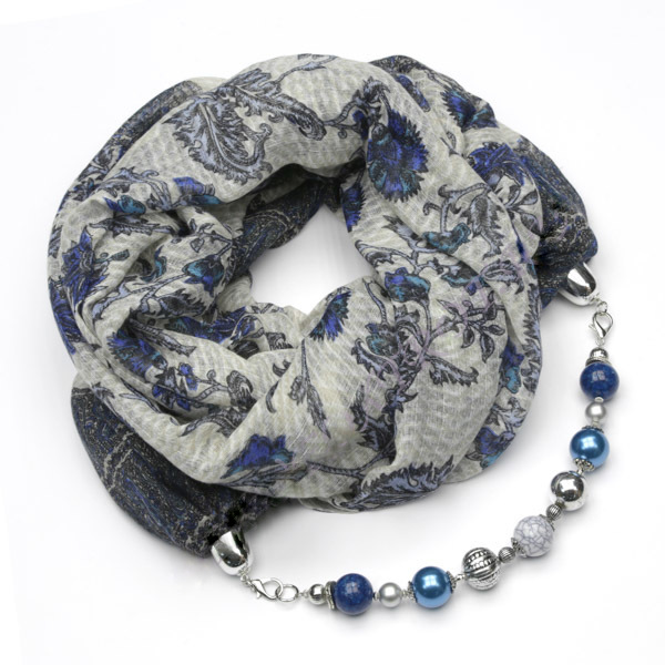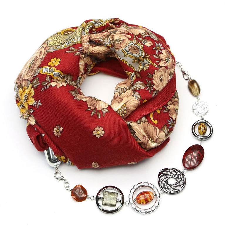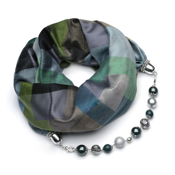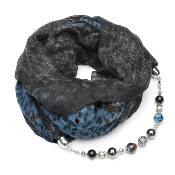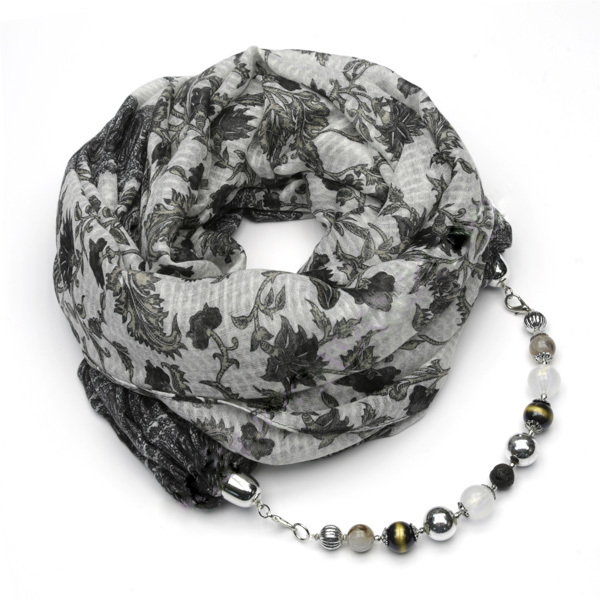 1. Шарф-ожерелье с бижутерией легко и просто укладывается вокруг шеи в 2-3 оборота. Шарфик оснащён замочком-карабином, благодаря которому его удобно одевать.