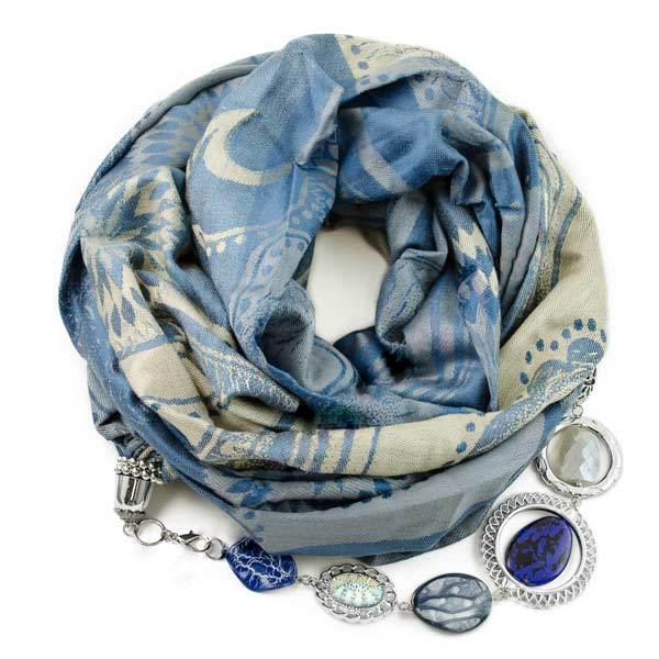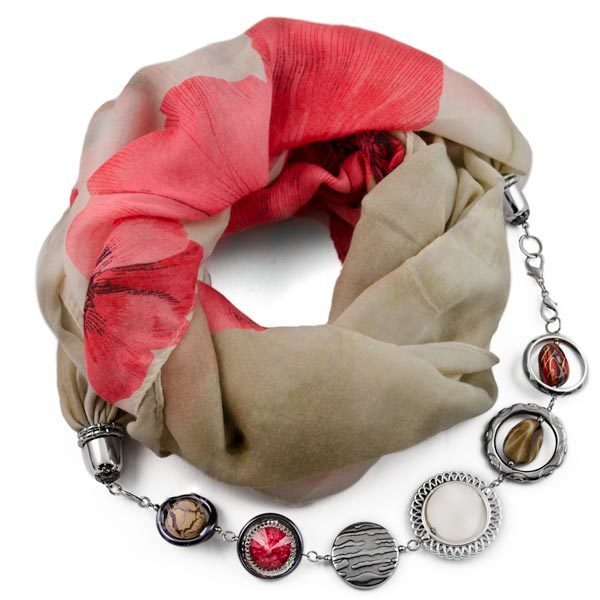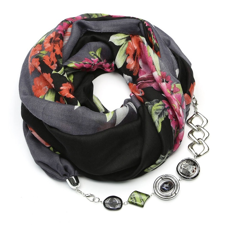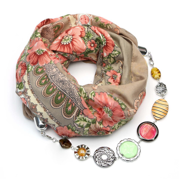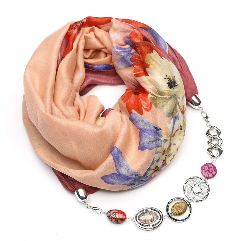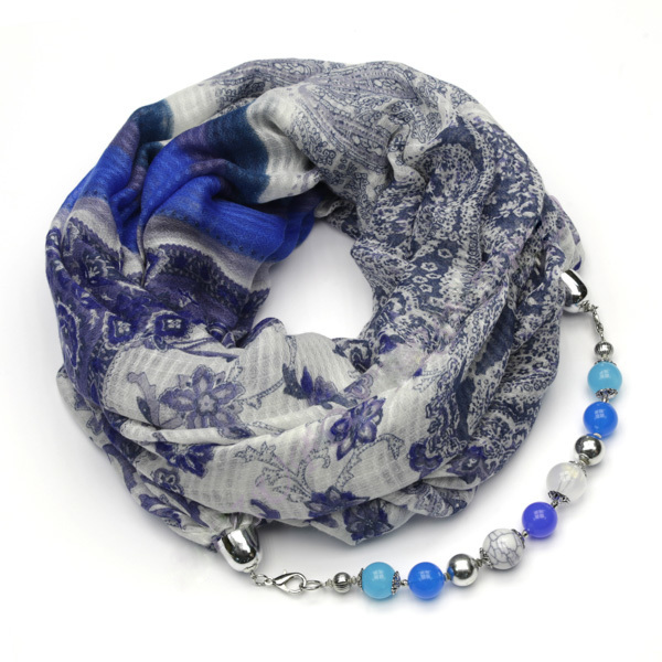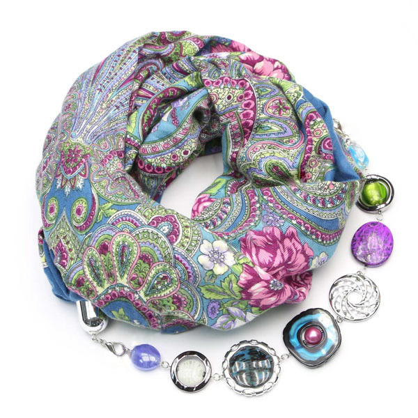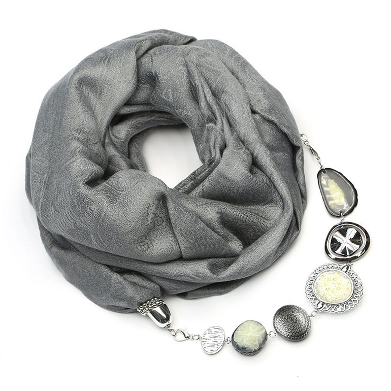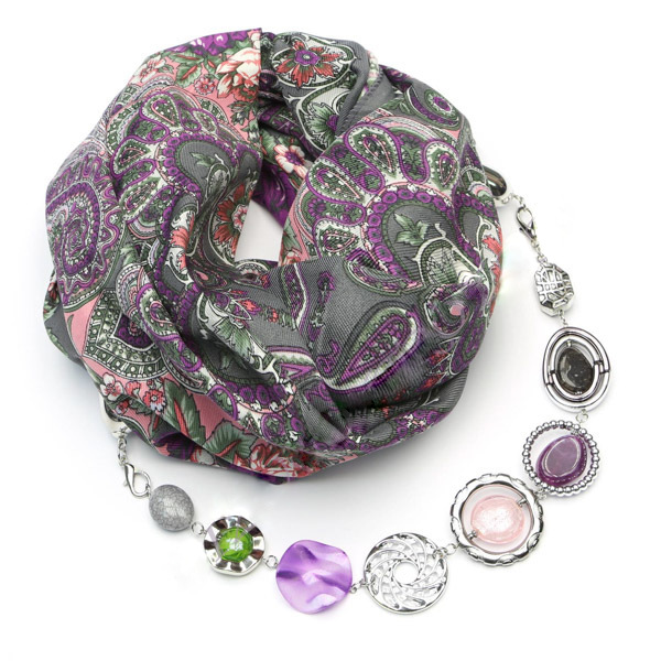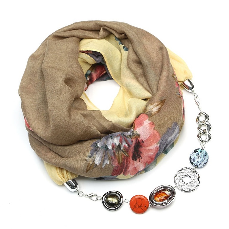 1. Шарф-ожерелье с бижутерией легко и просто укладывается вокруг шеи в 2-3 оборота. Шарфик оснащён замочком-карабином, благодаря которому его удобно одевать.